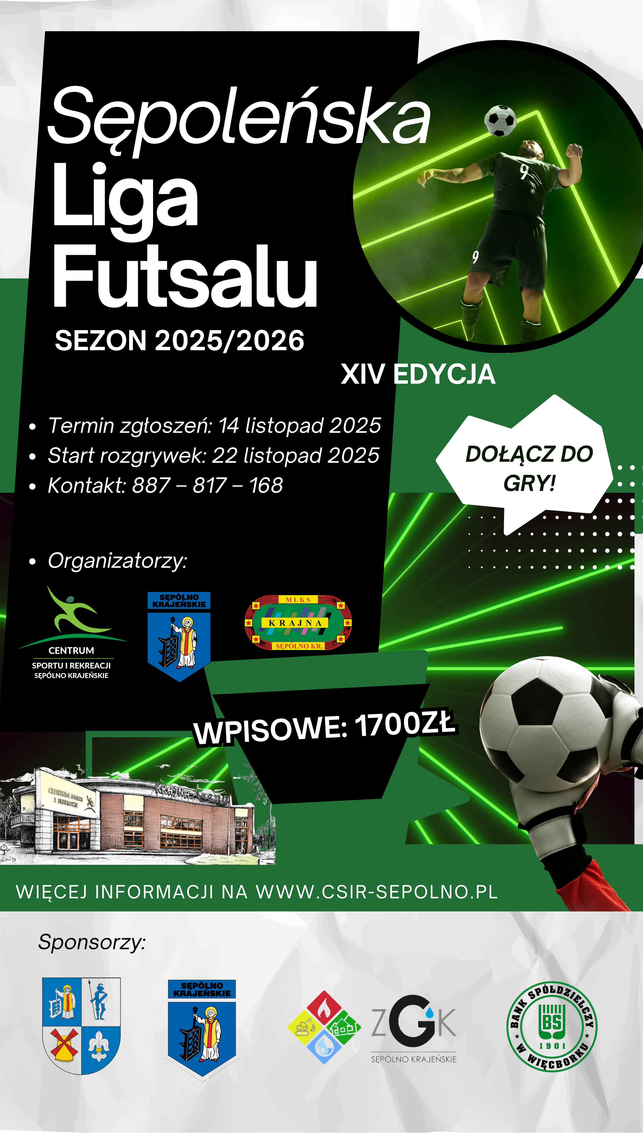 Gmina Sępólno Krajeńskie, Centrum Sportu i Rekreacji w Sępólnie Krajeńskim oraz MLKS Krajna Sępólno Krajeńskie zapraszają do udziału w XIV edycji Sępoleńskiej Ligi Futsalu. Zapisy przyjmowane będą do 14 listopada 2025r. Początek rozgrywek planowany jest na 22 listopada. Mecze rozgrywane będą w soboty oraz niedzielę. Drużyny można zgłaszać telefonicznie pod numerem: 887 - 817 - 168 lub osobiście na formularzu zgłoszeniowym (do pobrania). System rozgrywek uzależniony jest od ilości zgłoszonych drużyn. Zakończenie planowane jest 24 stycznia 2026r.