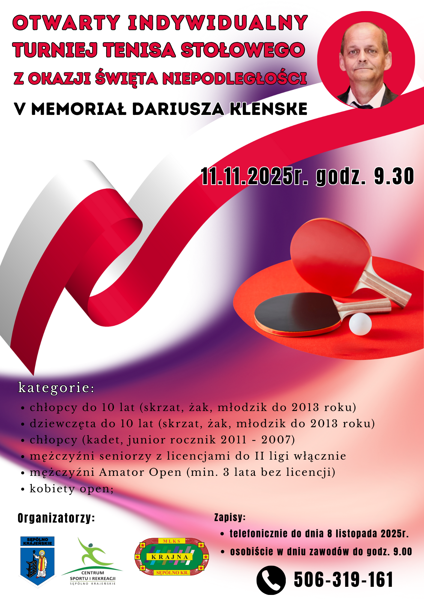Gmina Sępólno Krajeńskie, MLKS Krajna Sępólno Krajeńskie oraz Centrum Sportu i Rekreacji w Sępólnie Krajeńskim zaprasza na kolejny Otwarty Indywidualny Turniej Tenisa Stołowego z Okazji Święta Niepodległości. Będzie to także V Memoriał Dariusza Klenske, zmarłego, wieloletniego trenera i zawodnika MLKS Krajna. Zmagania odbędą się 11 listopada 2025r. (wtorek) o godz. 9.30 w hali Krajna Arena. Zapisy przyjmowane będą telefonicznie pod numerem telefonu 506-319-161 do dnia 8 listopada 2025r. lub osobiście w dniu zawodów do godz. 9.00. Turniej przeprowadzony zostanie w 6 kategoriach: