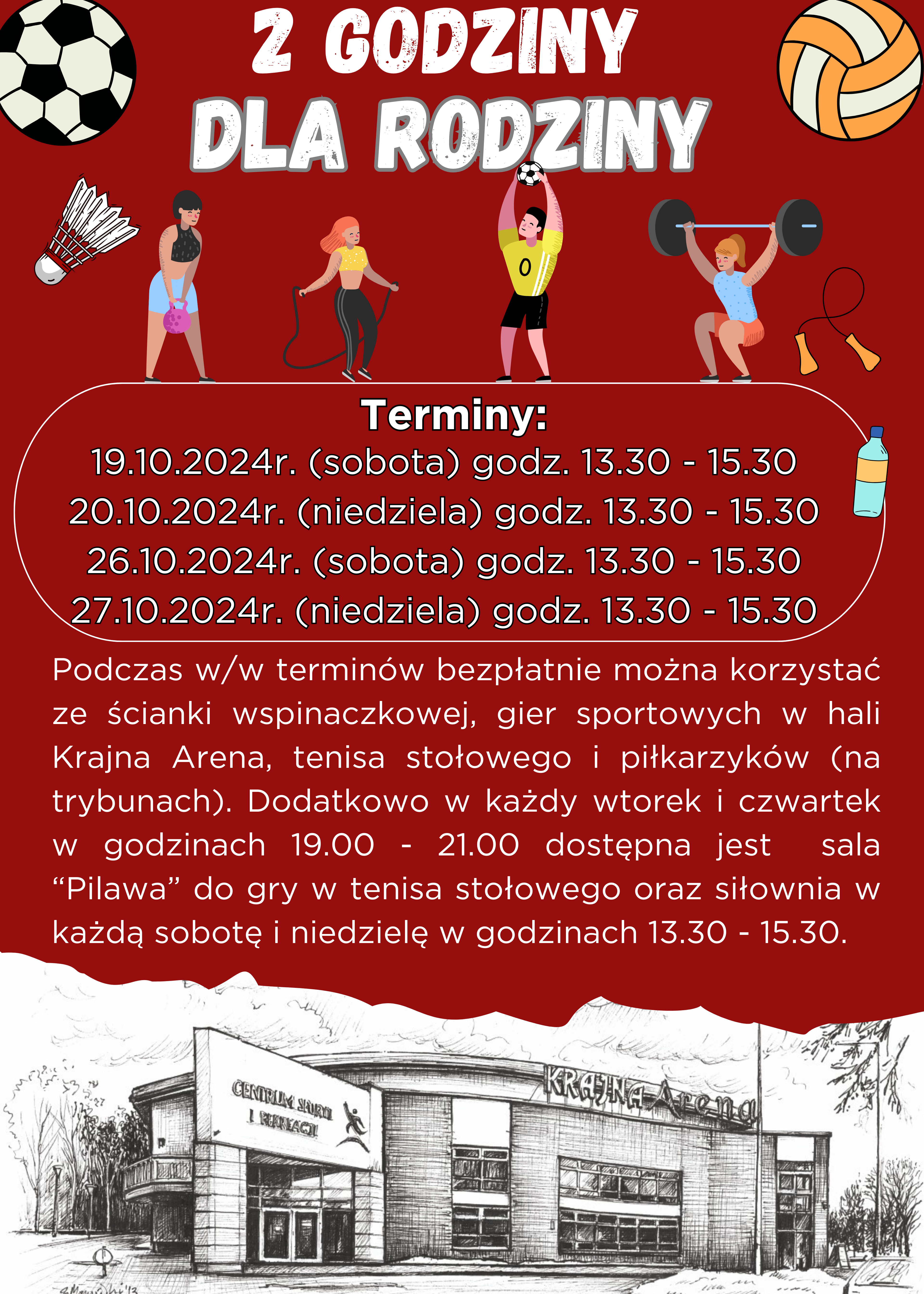 "Dwie godziny dla rodziny" to miejska inicjatywa adresowana do całych rodzin. Chodzi o to, aby zachęcić mieszkańców do aktywnego spędzania wolnego czasu. Jednocześnie jest to też promocja sępoleńskich obiektów sportowych. – W ramach akcji w naszej hali Krajna Arena będzie można korzystać ze sprzętu sportowego, ze ścianki wspinaczkowej, pograć w badmintona, no i wykorzystywać wszystko to, co jest dostępne dla sportowców – zapowiada Marek Chart, dyrektor Centrum Sportu i Rekreacji w Sępólnie Krajeńskim. Wstęp na salę jest bezpłatny i otwarty dla wszystkich. Ważne, aby zabrać ze sobą odpowiednie obuwie sportowe.