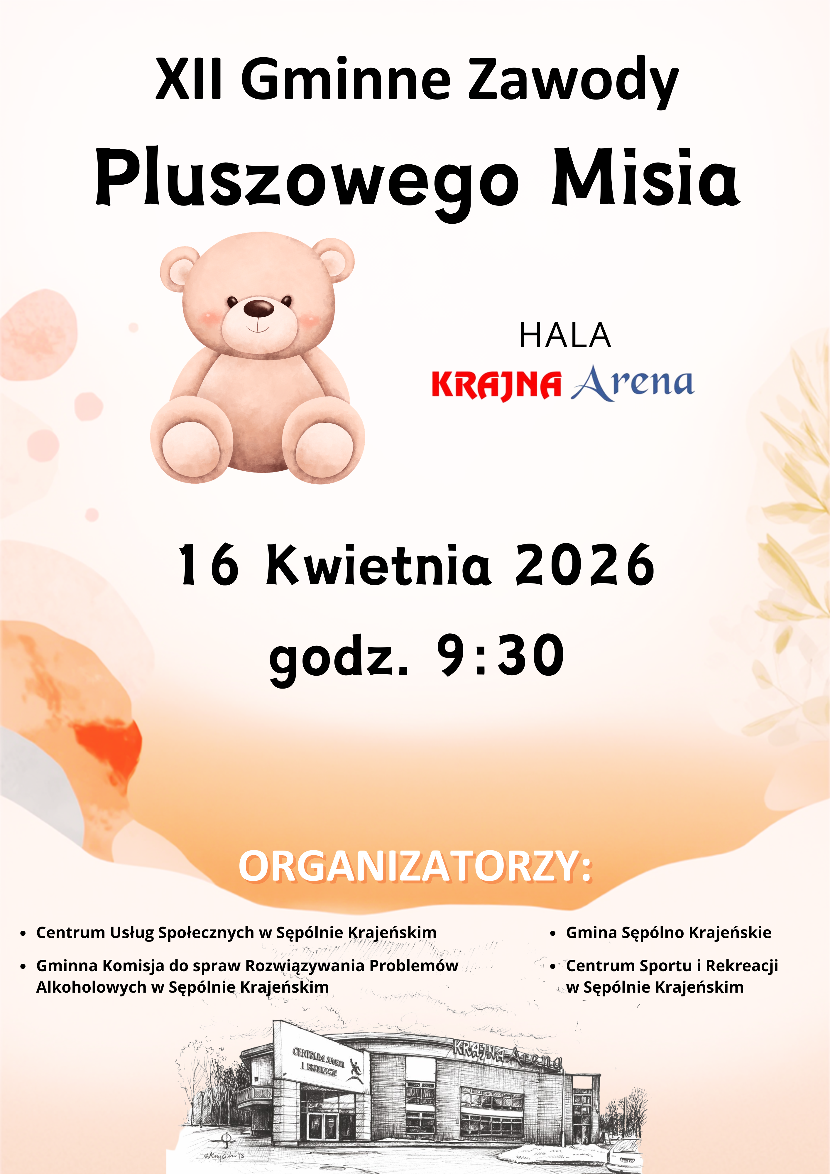 Centrum Usług Społecznych w Sępólnie Krajeńskim, Gminna Komisja ds. Rozwiązywania Problemów Alkoholowych w Sępólnie Krajeńskim, Gmina Sępólno Krajeńskie oraz Centrum Sportu i Rekreacji w Sępólnie Krajeńskim serdecznie zapraszają drużyny klas I, II i III ze szkół Gminy Sępólno Kraj. do wzięcia udziału w Gminnych Zawodach „PLUSZOWEGO MISIA”. Zmagania odbędą się 16 kwietnia 2026r. o godz. 9.30 w hali Krajna Arena ul. Chojnicka 19. Zgłoszenia przyjmowane będą do 31 marca 2026r w formie elektronicznej z podaniem klas na adres biuro@csir-sepolno.pl. Komplet zgód należy dostarczyć do CSiR osobiście najpóźniej w dniu zawodów. Wszystkie niezbędne dokumenty oraz scenariusz zabaw dostępne są w załączeniu.