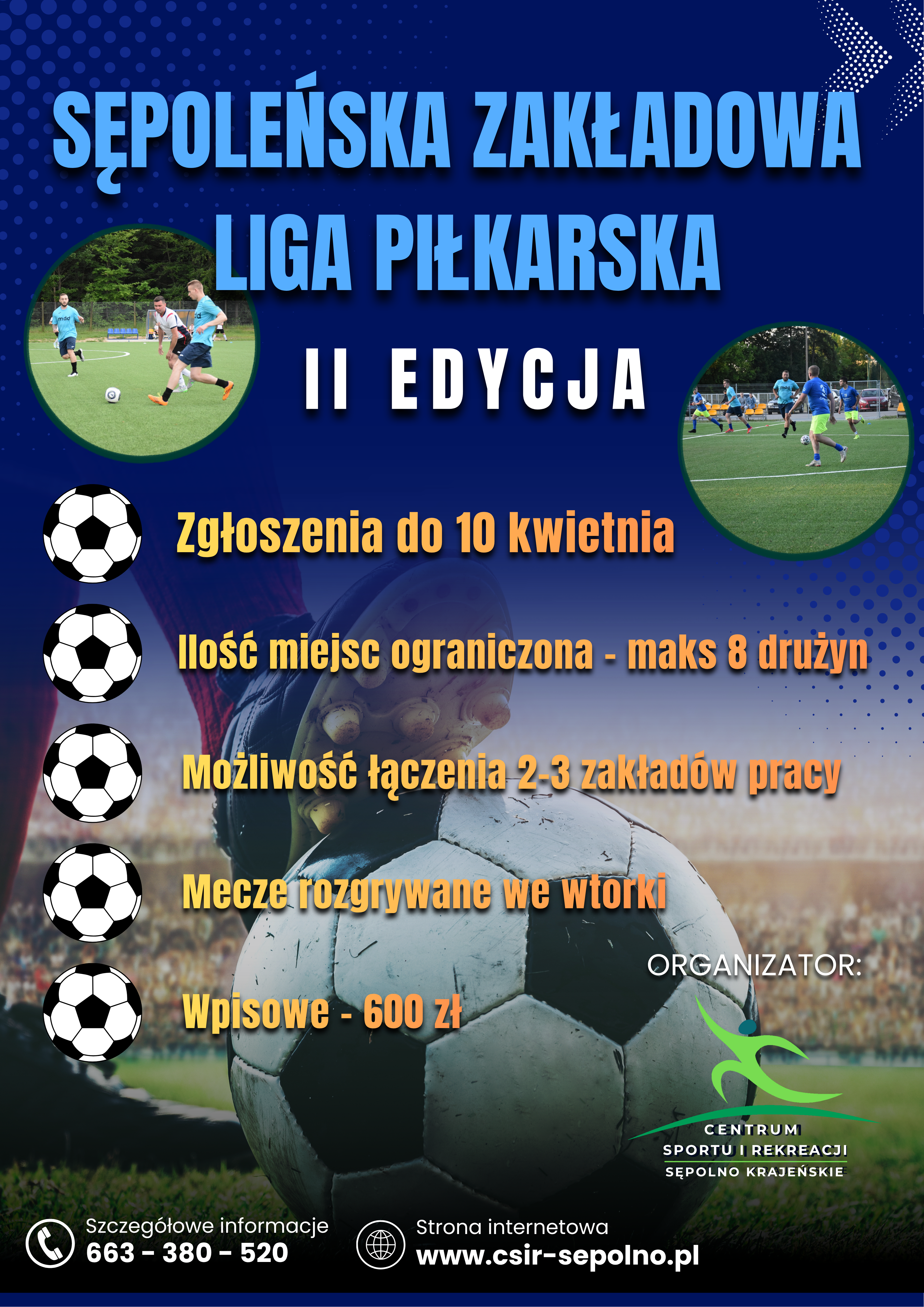 Centrum Sportu i Rekreacji w Sępólnie Krajeńskim zaprasza do udziału w II Edycji Sępoleńskiej Zakładowej Lidze Piłkarskiej. Do rozgrywek zostanie przyjętych maksymalnie 8 zespołów. Mecze rozgrywane będą w tygodniu w godzinach wieczornych (proponowane są wtorki). Drużyny zgłaszają zakłady pracy. W przypadku niewystarczającej ilości pracowników istnieje możliwość połączenia maksymalnie 3 zakładów pracy. Zgłoszenia przyjmowane będą do 10 kwietnia. Drużyna może składać się z osób wyłącznie zatrudnionych w danym zakładzie pracy w okresie obejmującym rozgrywki ligowe (również występujący w klubach piłkarskich) – mogą również grać uczniowie odbywający praktyki zawodowe.