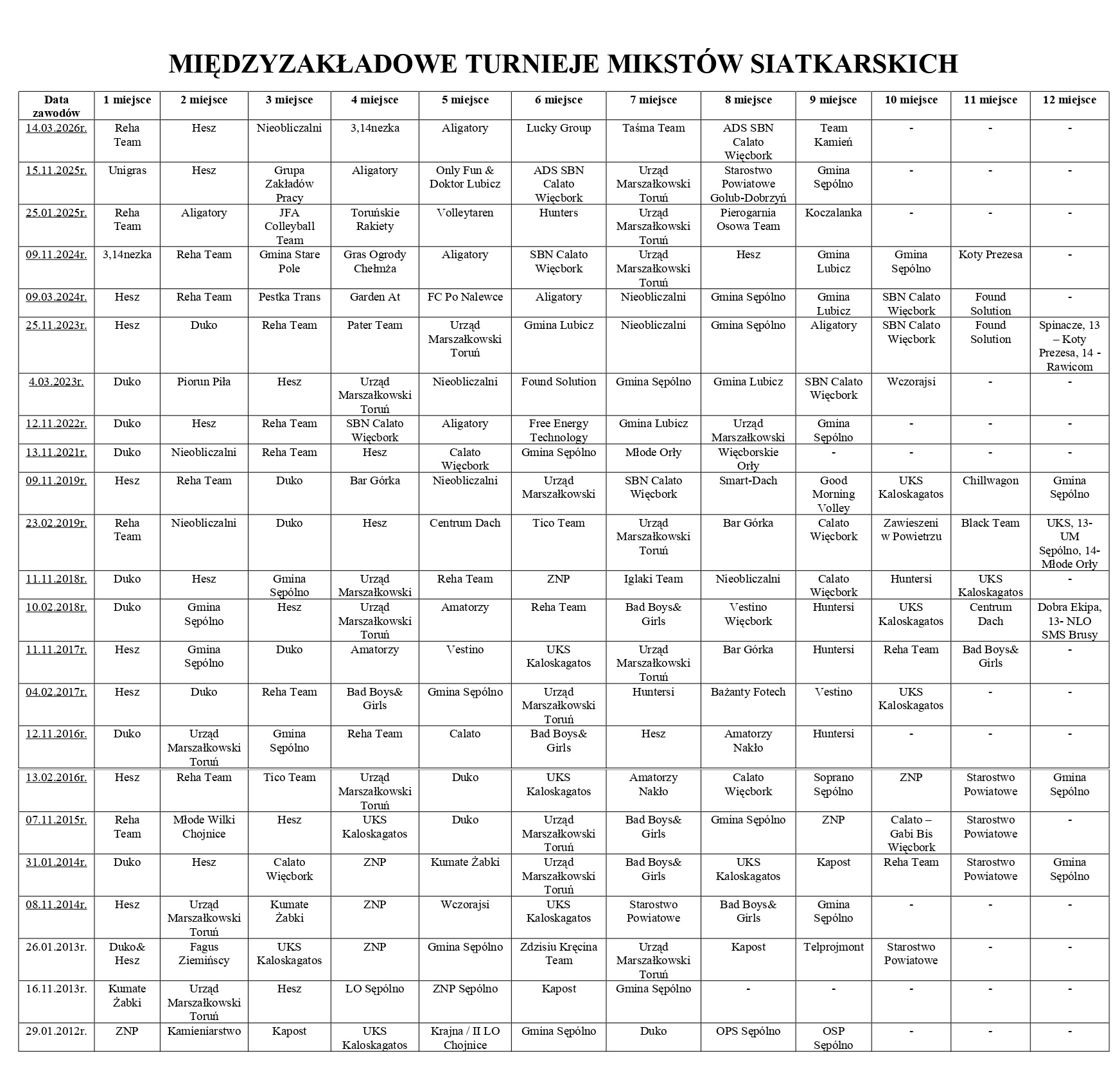 Siatkarskie turnieje mikstów to wydarzenie z bogatą historią, która jednoczy lokalnych sportowców od blisko dwóch dekad. Pomysłodawcą rozgrywek było stowarzyszenie UKS Kaloskagatos, działające przy Liceum Ogólnokształcącym w Sępólnie Krajeńskim. Dzięki niemu narodziła się idea wspólnej rywalizacji kobiet i mężczyzn. Przez pierwsze lata pasjonaci siatkówki spotykali się w sali sportowej miejscowego liceum, a od 2012r. rozgrywki przeniesione zostały do nowoczesnych obiektów Centrum Sportu i Rekreacji w Sępólnie Krajeńskim.