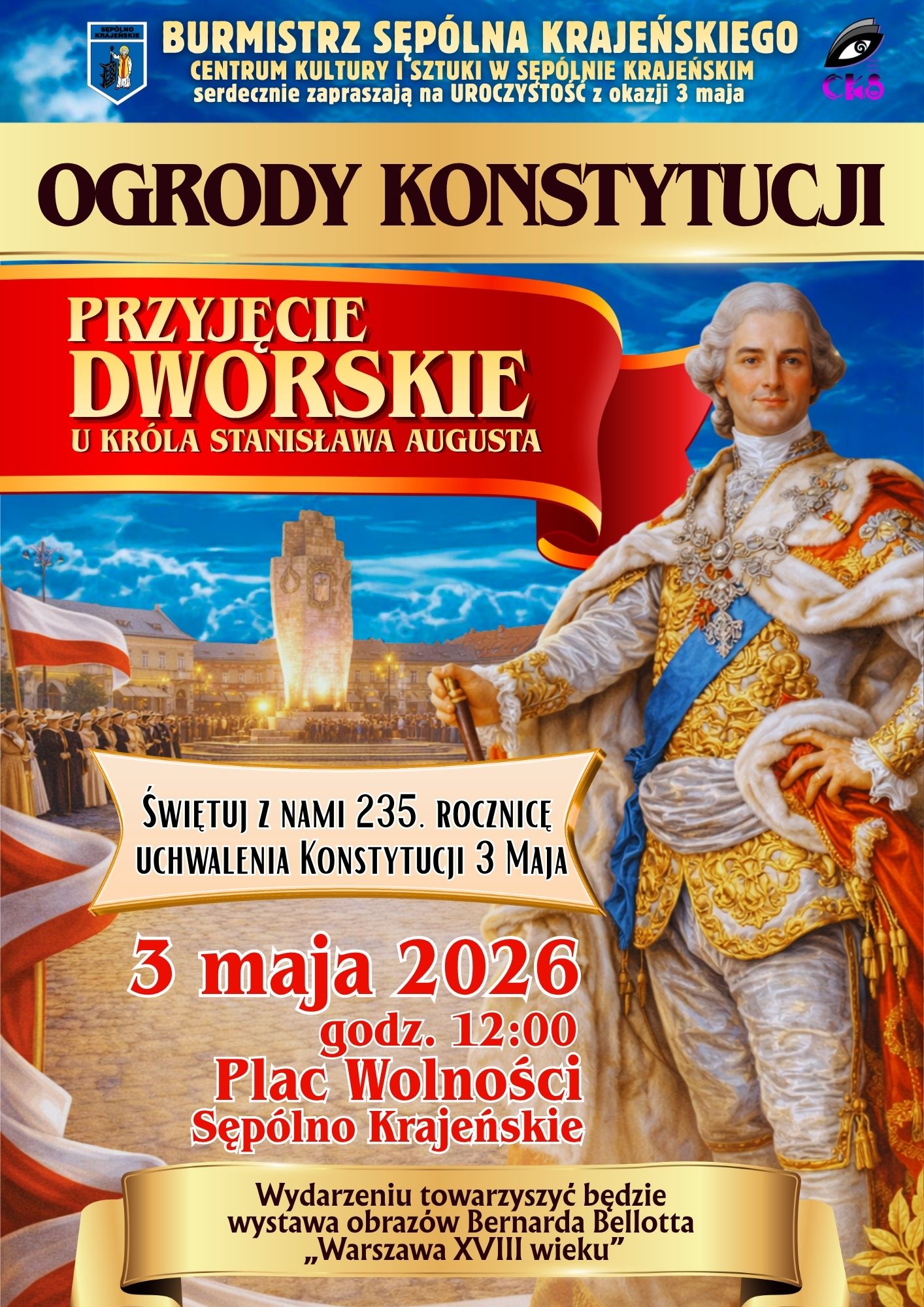 12.00 – Ogrody Konstytucji – widowisko plenerowe organizowane przez CKiS. Na Placu Wolności przedstawiona zostanie inscenizacja przyjęcia dworskiego u Króla Stanisława Augusta. Spektakl będzie nawiązywał do wydarzeń z 1971 roku. Widowisku towarzyszyć będzie wystawa obrazów Bernarda Bellotta, przedstawiających XVIII wieczną Warszawę.