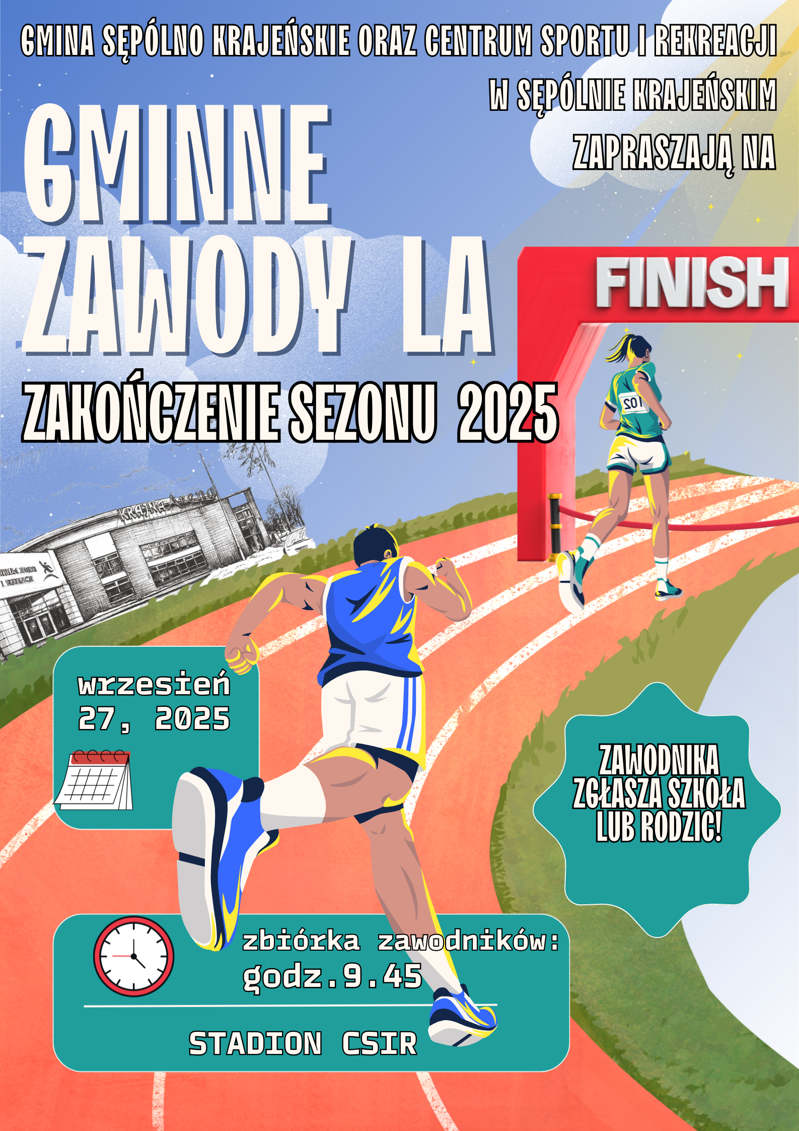 Centrum Sportu i Rekreacji w Sępólnie Krajeńskim zaprasza do udziału w Gminnych Zawodach LA - Zakończenie Sezonu 2025. Zmagania odbędą się 27 września (sobota) o godz. 9.45. Prawo do startu mają uczniowie szkół podstawowych naszej gminy. Program zawodów obejmuje: biegi, skok w dal, skok wzwyż, rzut piłeczką palantową oraz pchnięcie kulą. Zgłoszenia przyjmowane będą do 24 września (środa) do godz. 22.00. Po tym terminie można zgłosić się do zawodów dopiero bezpośrednio przed konkurencją. Trzech najlepszych zawodników w każdej kategorii otrzyma pamiątkowe medale.