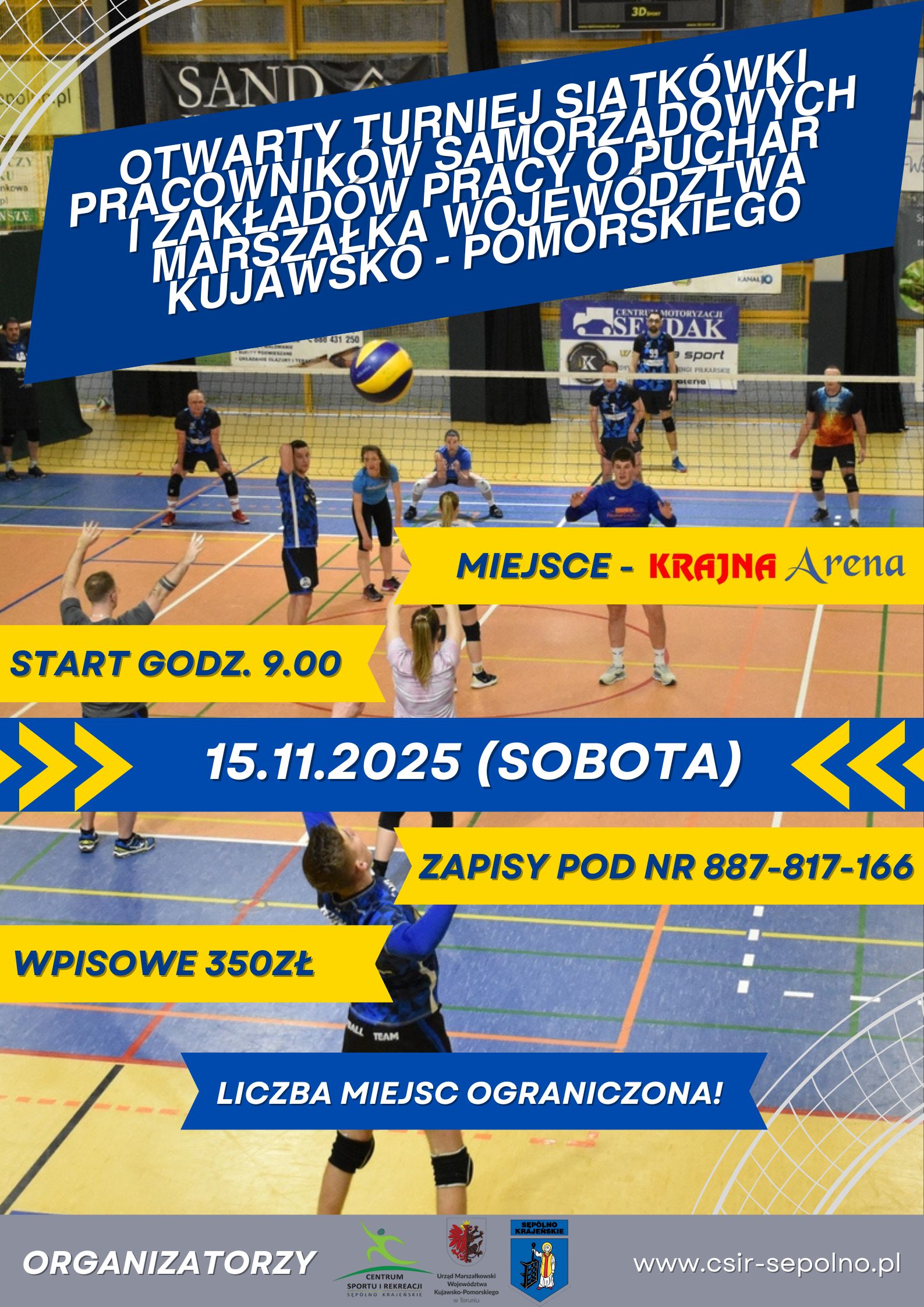 Zapraszamy do udziału w Otwartym Turnieju Siatkówki Pracowników Samorządowych i Zakładów Pracy o Puchar Marszałka Województwa Kujawsko - Pomorskiego. Turniej organizowany jest w ramach obchodów Święta Niepodległości. Organizatorami wydarzenia są: Urząd Marszałkowski Województwa Kujawsko - Pomorskiego w Toruniu, Gmina Sępólno Krajeńskie oraz Centrum Sportu i Rekreacji w Sępólnie Krajeńskim. Zmagania odbędą się 15 listopada (sobota) o godz. 9.00. W rozgrywkach mogą brać udział drużyny amatorskie, składające się z pracowników samorządowych, innych zakładów pracy oraz sympatyków siatkówki. Wpisowe wynosi 350zł od drużyny. Wszystkie zespoły otrzymają pamiątkowe puchary oraz dyplomy, a najlepsza trójka medale. Dodatkowo wyróżniony zostanie najlepszy zawodnik i zawodniczka turnieju.